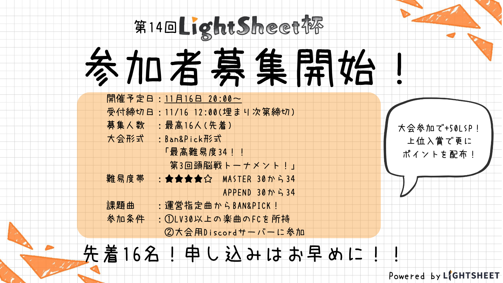 そのため従来のLightSheet杯より30分前倒しの19:30より開催させていただきます。