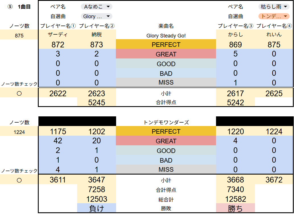各チーム課題曲一覧から1曲PICKし計2曲で試合を行う。