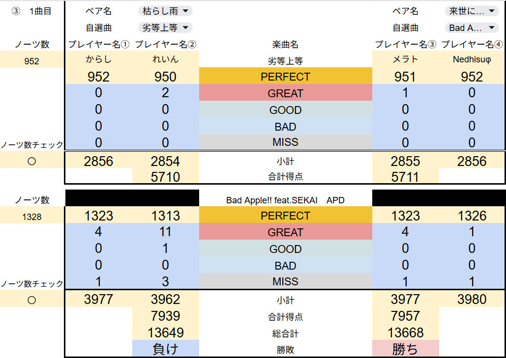 楽曲のプレイ順は、トーナメントの左側のチームの選曲を1曲目とします。